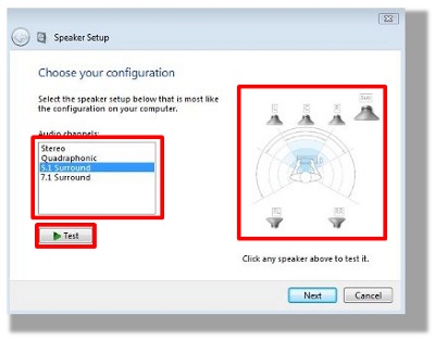 - Select a speaker setup, and then select "Test" or the speaker icon on the right side to test the sound.