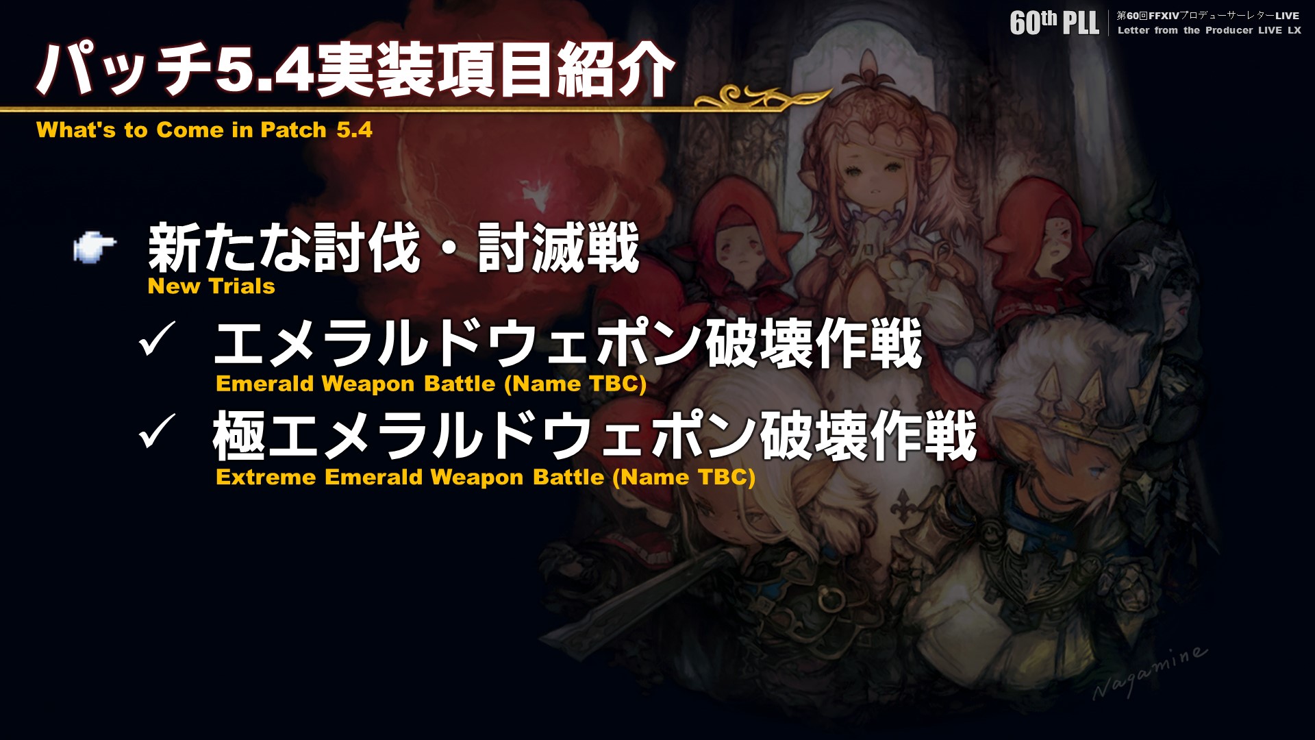 The next chapter of the Sorrow of Werlyt will be added, along with a new trial where you’ll battle the Emerald Weapon. (The name of the trial is still being decided.)