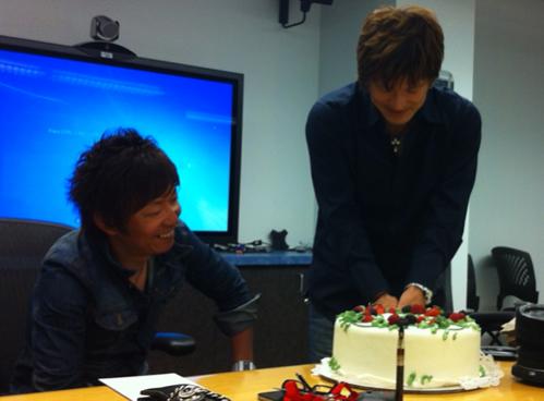 During Yoshi-P's business trip to the Square Enix America offices, we all gathered to celebrate his birthday! Here's a picture of us cutting his cake!
