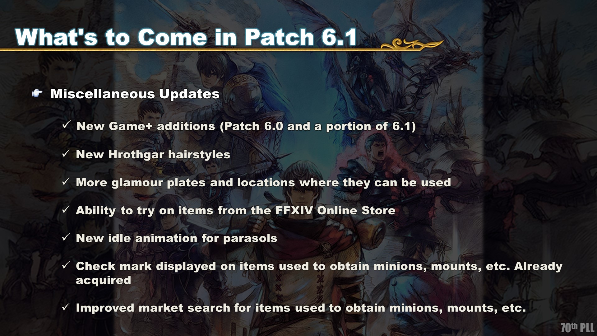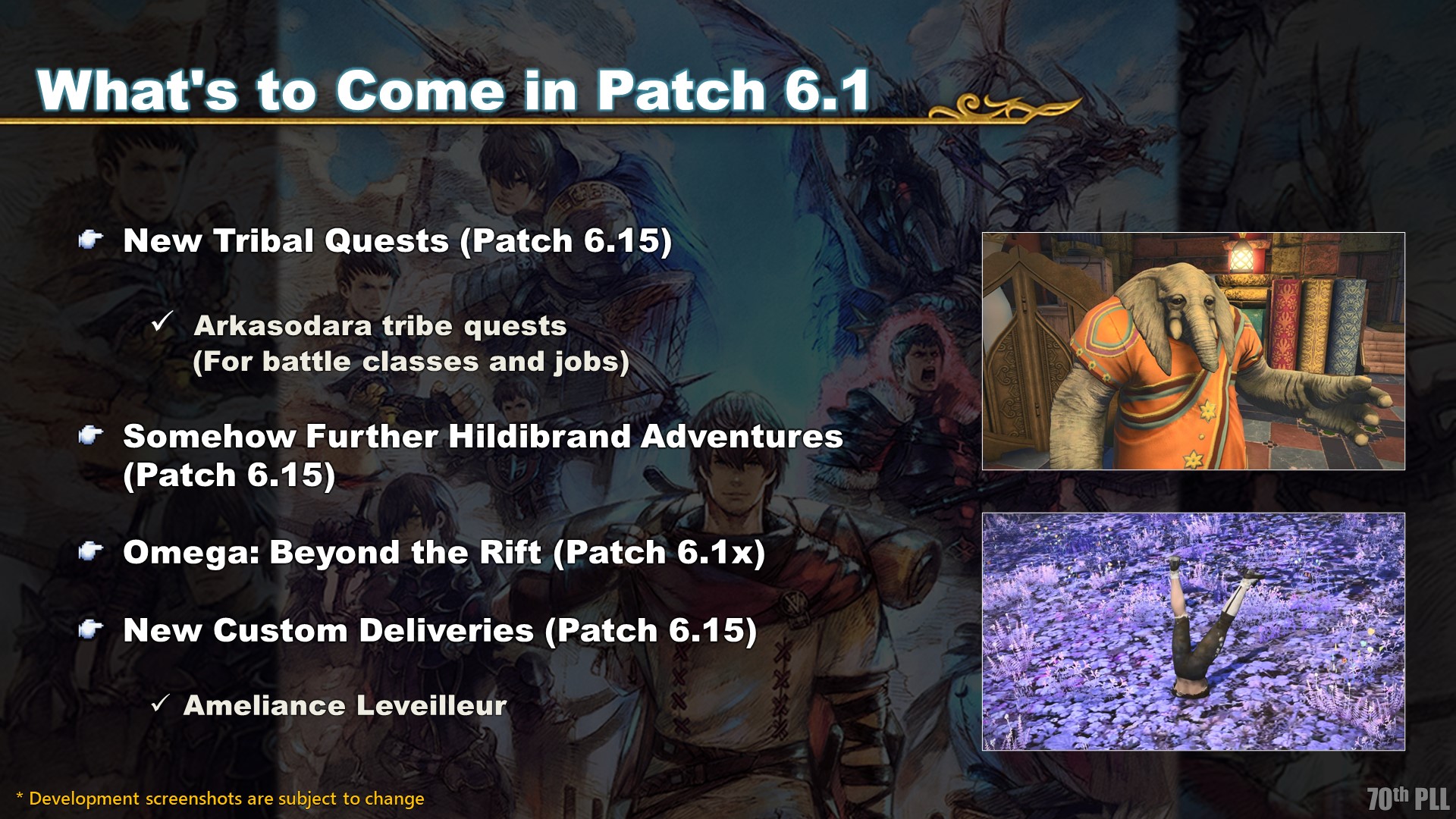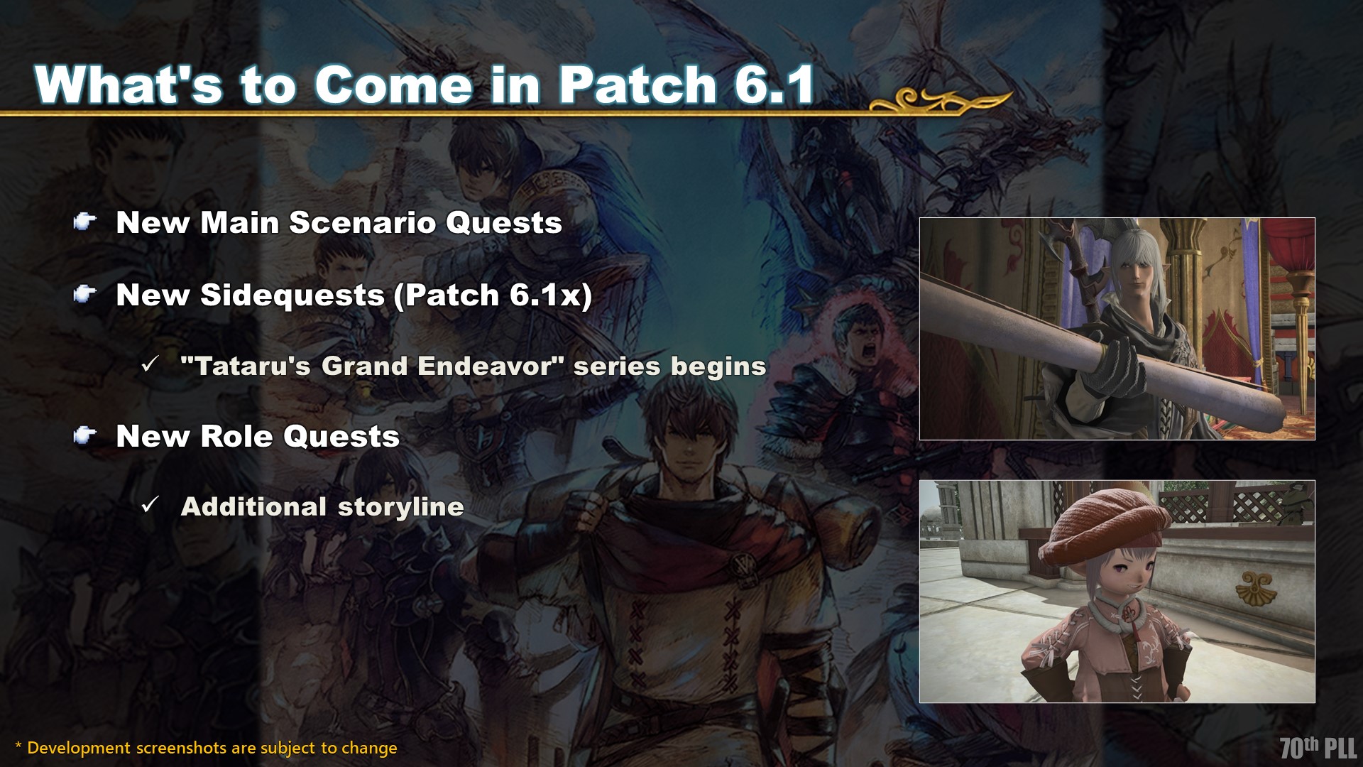 Although “Tataru’s Grand Endeavor” was previously announced to release in Patch 6.1, its story felt strange to progress alongside the main scenario, so we’ve rescheduled it for Patch 6.15. We hope you’ll take your time to play through it after having completed the 6.1 main scenario.