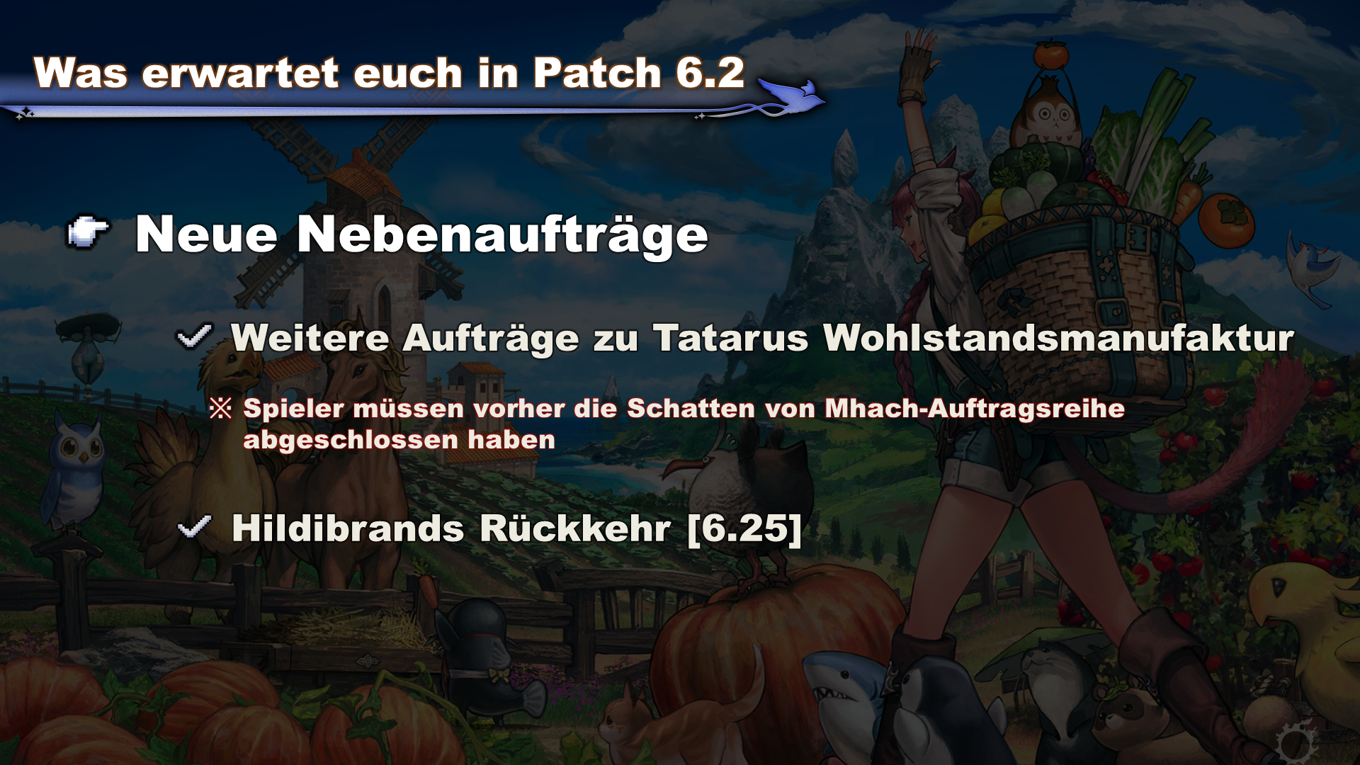 Der nächste Teil von „Tatarus Wohlstandsmanufaktur“ wird auf die bisher erlebten Abenteuer des Kriegers des Lichts zurückblicken. Dabei werden wir bekannte Gesichter aus der „Schatten von Mhach“-Serie wiedersehen! Das Abschließen der „Schatten von Mhach“-Auftragsreihe wird vorausgesetzt, um fortfahren zu können. Es ist also eine großartige Gelegenheit, Spielinhalte aufzuholen, wenn ihr diese nicht bereits abgeschlossen habt.