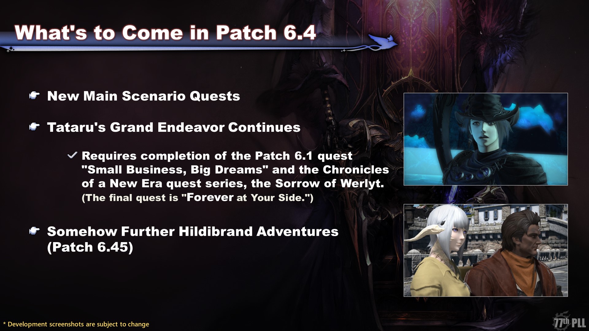 Tataru’s Grand Endeavor will give us yet another opportunity to catch up with familiar faces from our journeys thus far. The latest update will require completion of the Sorrow of Werlyt sidequests up to “Forever at Your Side.”