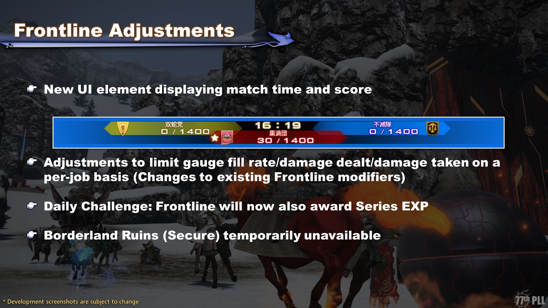 Another major change to the battle aspects is balancing Frontline modifiers on a per-job basis; namely, limit break gauge fill rate, damage dealt, and damage taken. A job’s limit break gauge fill rate will be balanced based on the effectiveness of their limit break in Frontline, so some jobs will accumulate gauge faster or slower compared to before.