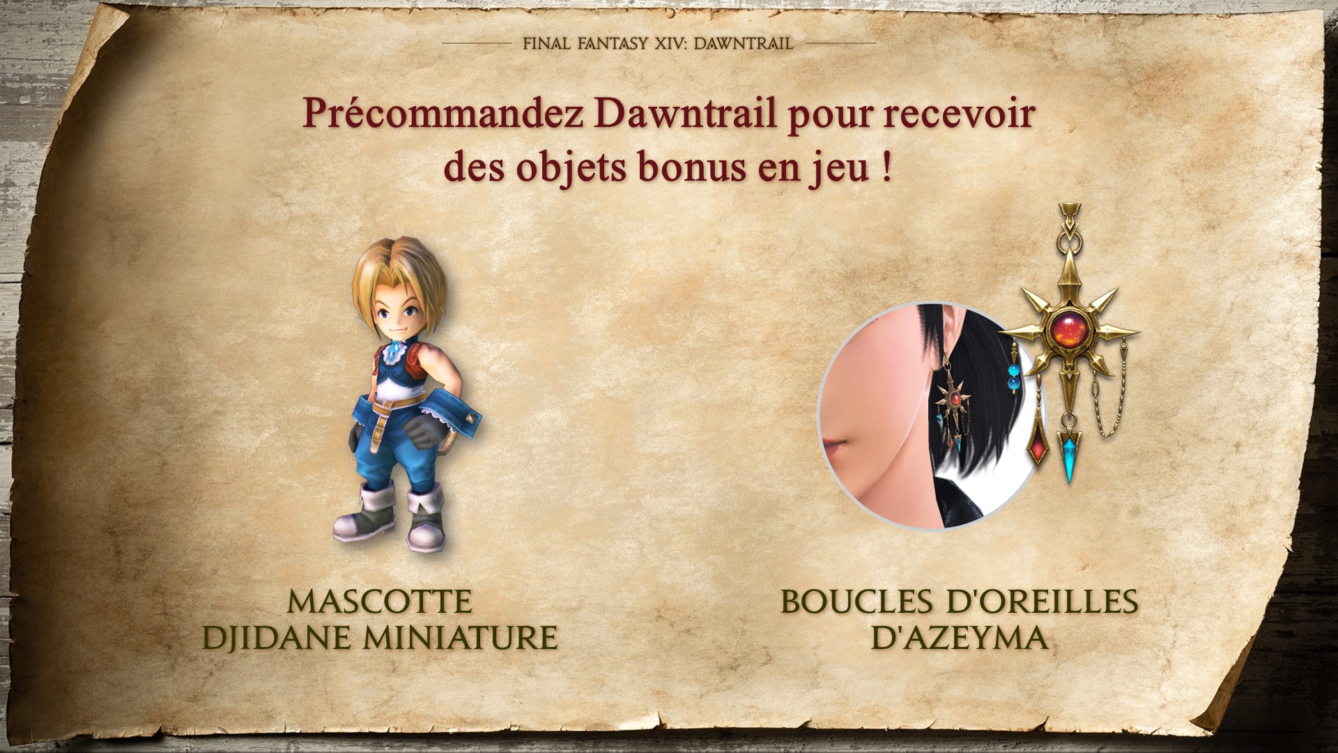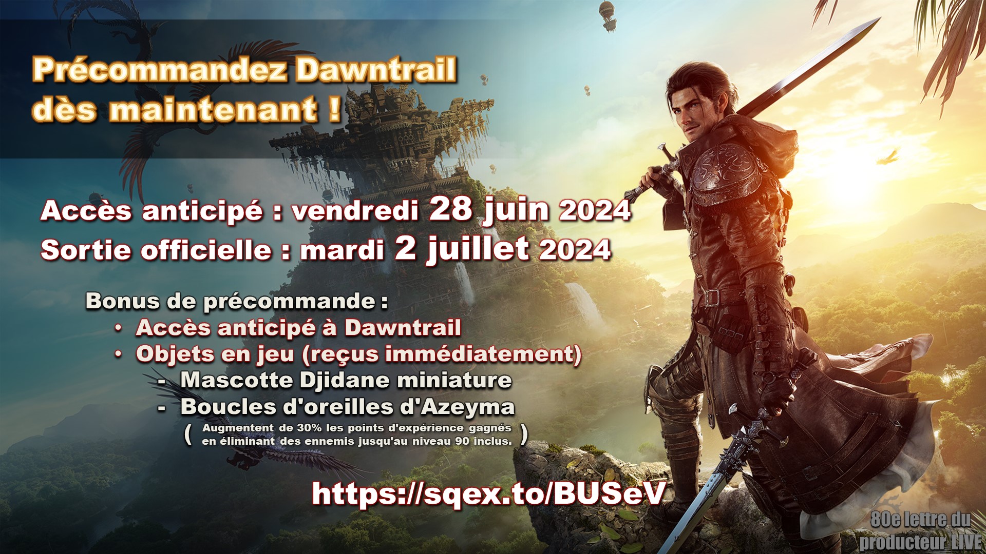 Précommandez avant la sortie officielle pour recevoir les bonus suivants : - Accès anticipé à Dawntrail, le vendredi 28 juin 2024