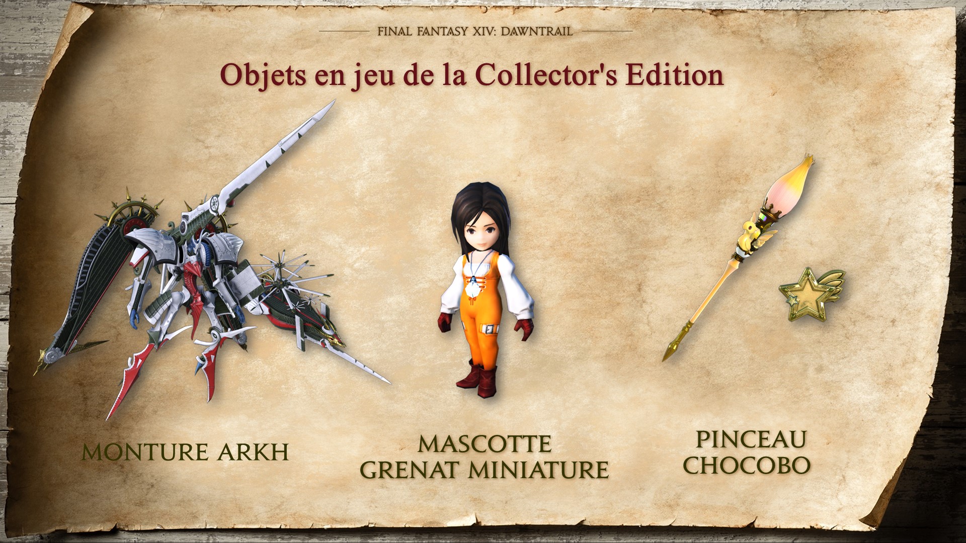 De plus, la Collector's Edition de Dawntrail vous offrira les objets exclusifs suivants à la sortie officielle :- Monture Arkh