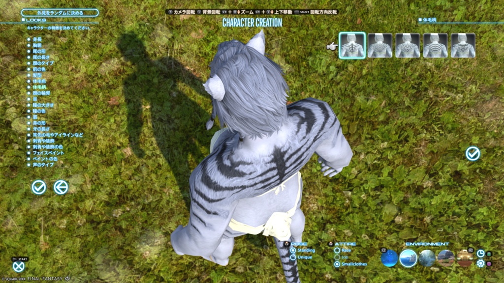 1.美容師やキャラメイク画面にて、体毛柄タブの体毛柄1(一番左)を選択する