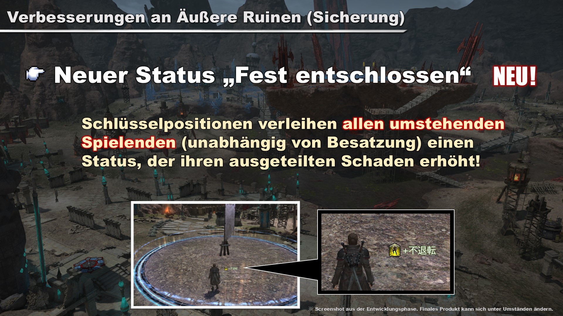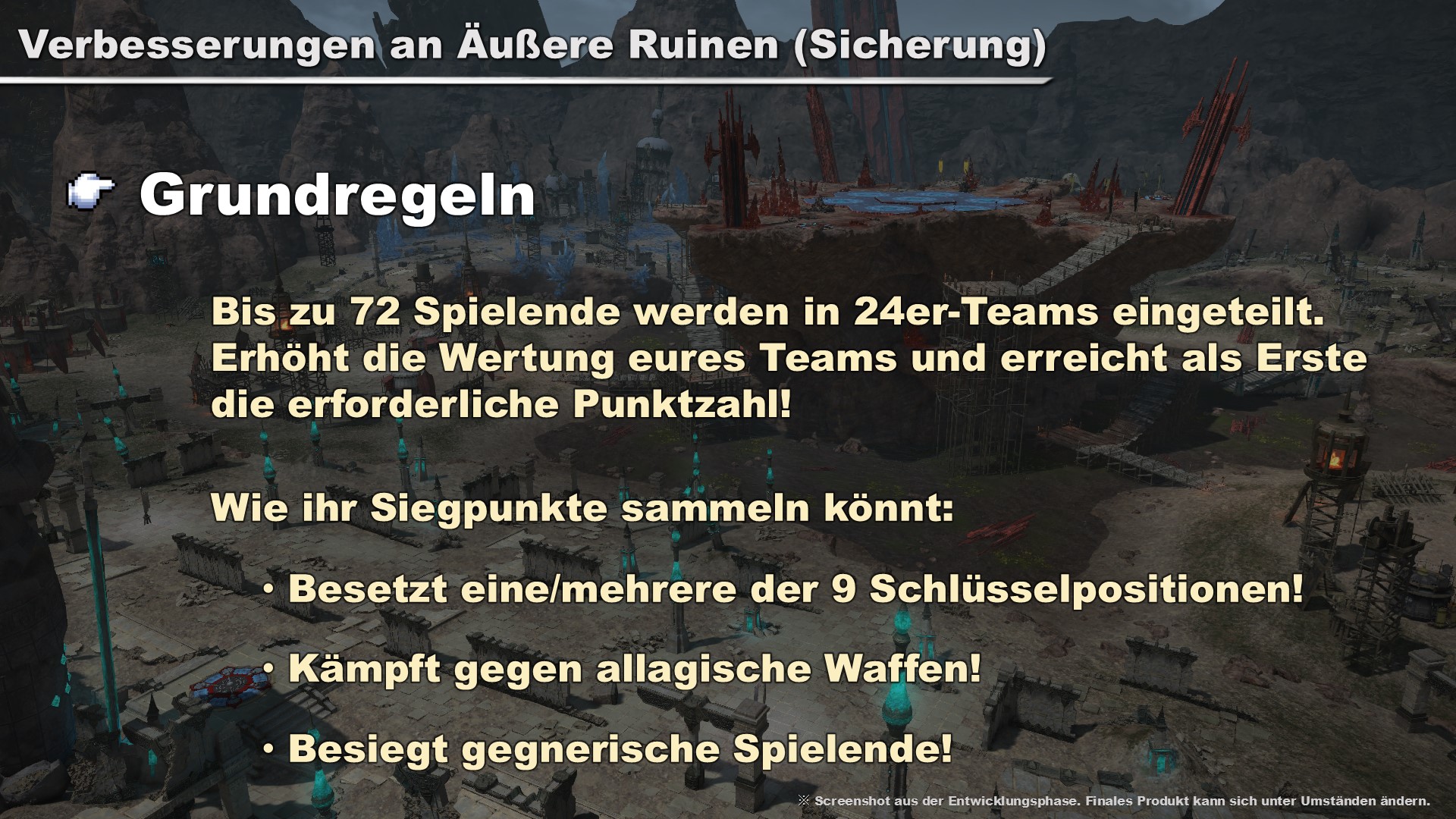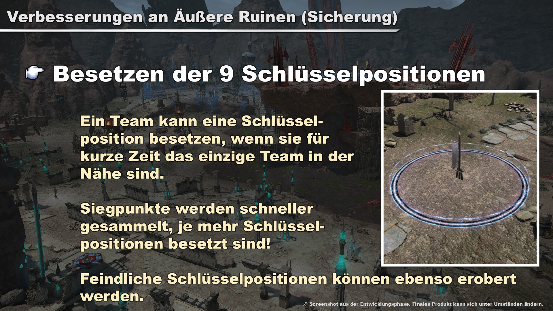 Äußere Ruinen (Sicherung) wurde überarbeitet und um verschiedene neue Elemente erweitert. Allen Spielenden im Bereich einer Schlüsselposition wird ein signifikanter Status zur Schadenswirkung verliehen, was einer relativ kleinen Gruppe von Spielenden helfen könnte, eine Schlüsselposition von einer größeren Gruppe zurückerobern.