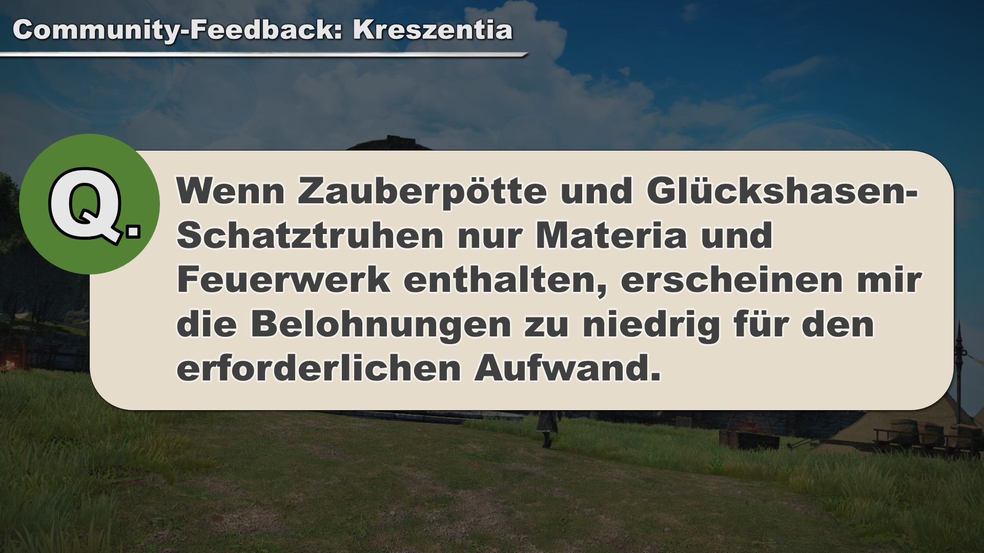 Wir glauben, dass es sich hierbei um eine Fehlschätzung des Entwicklerteams handelt. Schatztruhen von Zauberpötten und Glückshasen enthalten immer Gil, was Teil der unserer Überlegung war, als wir die Belohnungen ausbalanciert haben. Der vom Entwicklerteam wahrgenommene Wert von Gil wich jedoch von der Einschätzung unserer Spielenden ab.