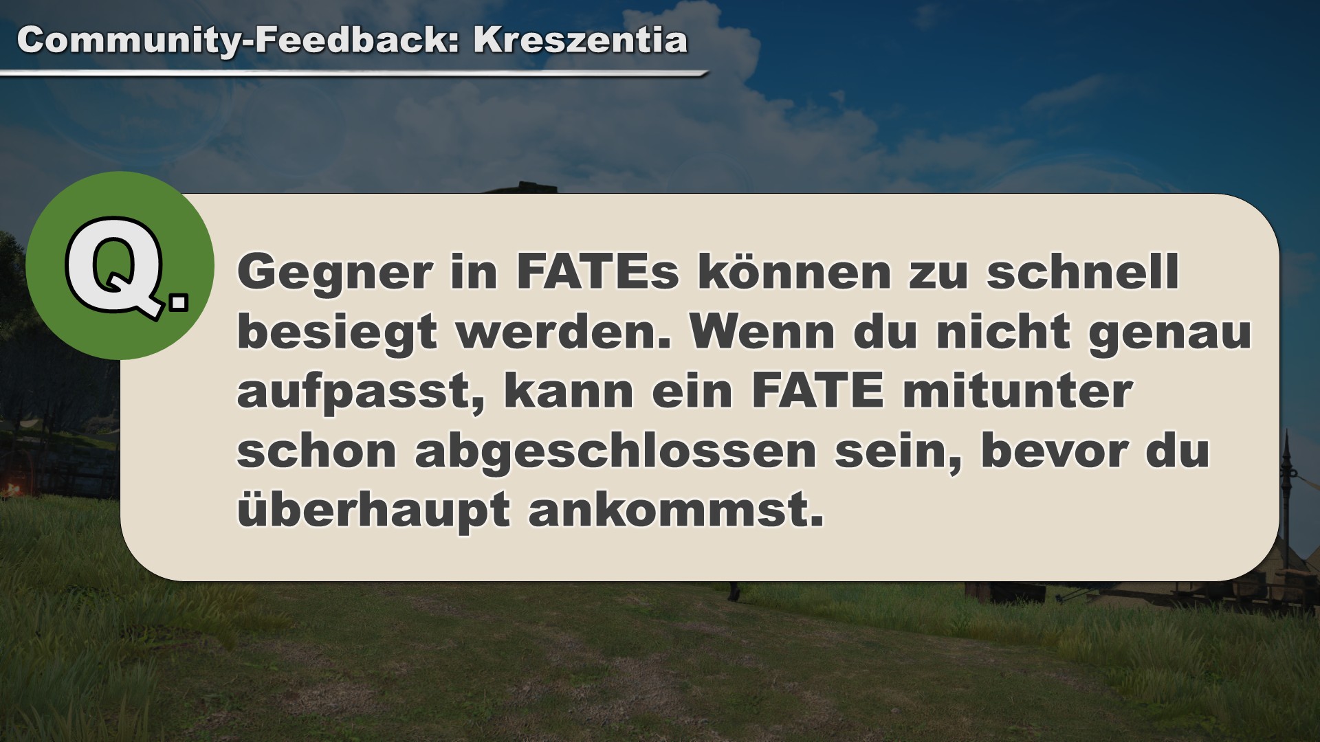 Wir haben Vorschläge gesehen, mehrere FATEs gleichzeitig auszulösen, aber die maximale Anzahl laufender Kämpfe ist durch die Serverbelastung begrenzt. Obwohl wir gern so viele FATEs gleichzeitig auslösen möchten wie möglich, müssen wir im Hinterkopf behalten, dass der Server abstürzen wird, wenn es zu viele werden.