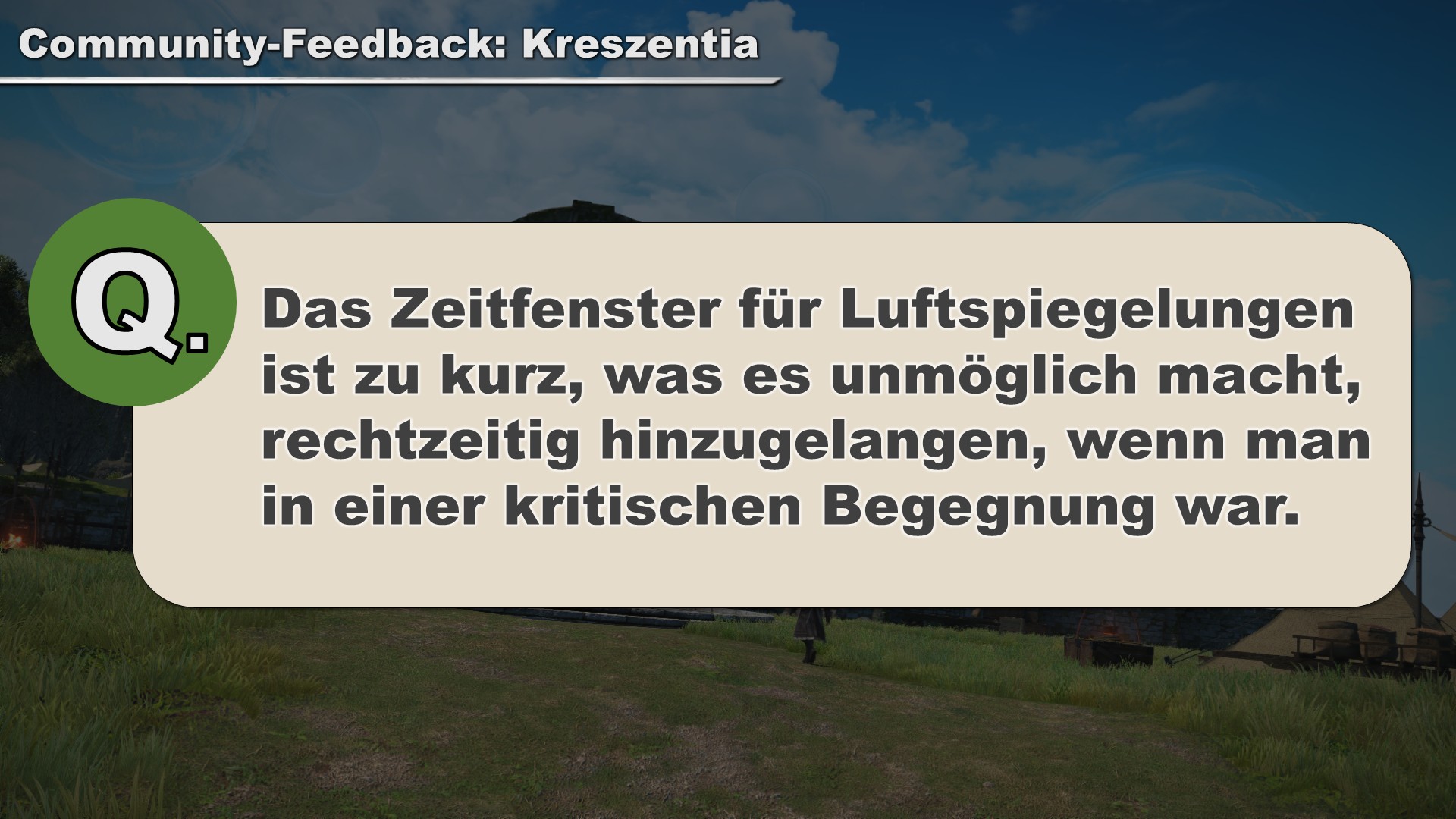 Was die Schatztruhen im offenen Gelände betrifft, so haben wir uns für einige attraktive Belohnungen entschieden, da diese Truhen mit den Hauptaktivitäten von Kreszentia zusammenhängen: kritischen Begegnungen, FATEs und Mob-Farmen. Des Weiteren hatten wir in der Vergangenheit die Rückmeldung erhalten, bestimmte Belohnungen, wie Frisuren, nicht zu schwer erhältlich zu machen.