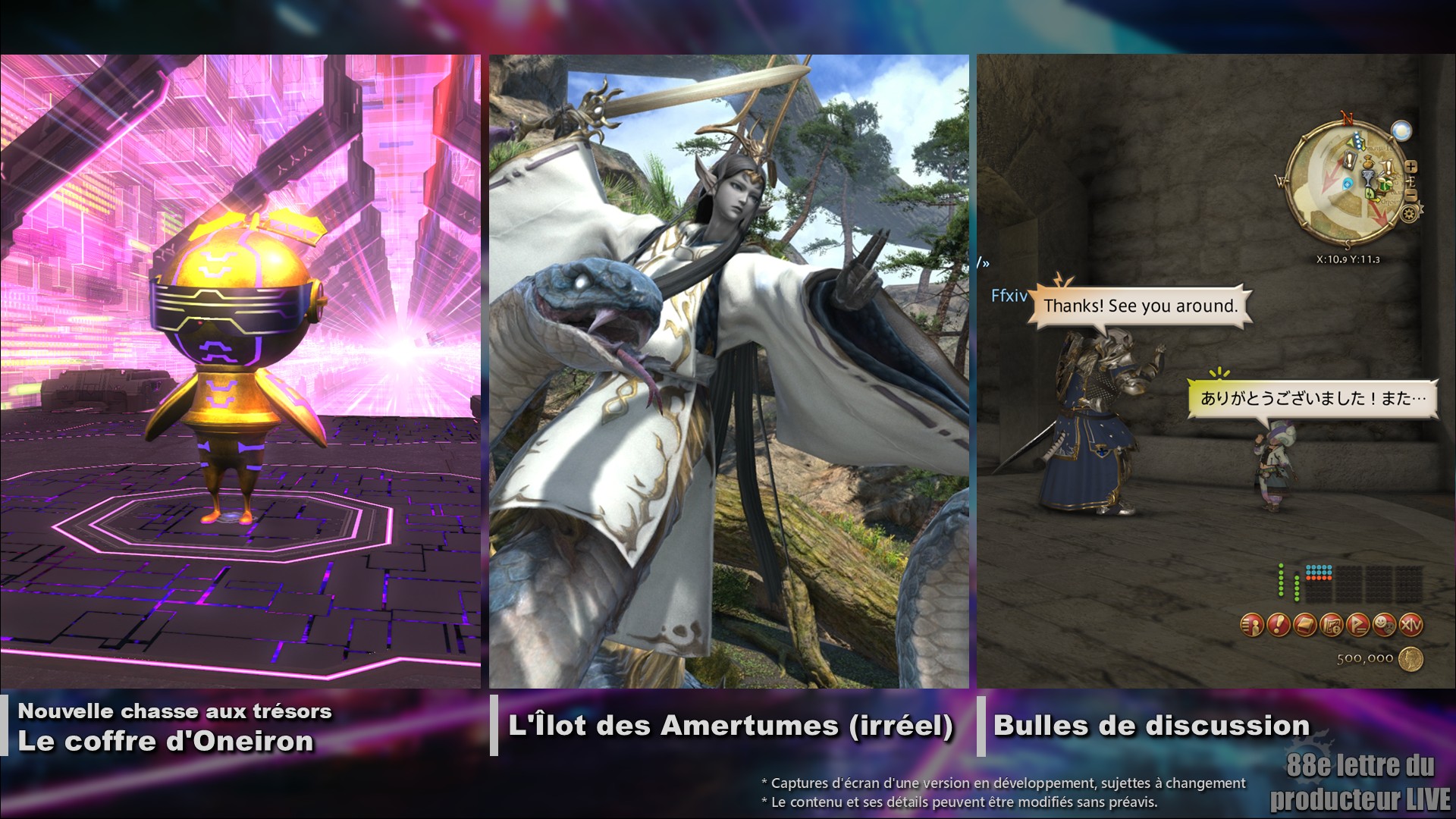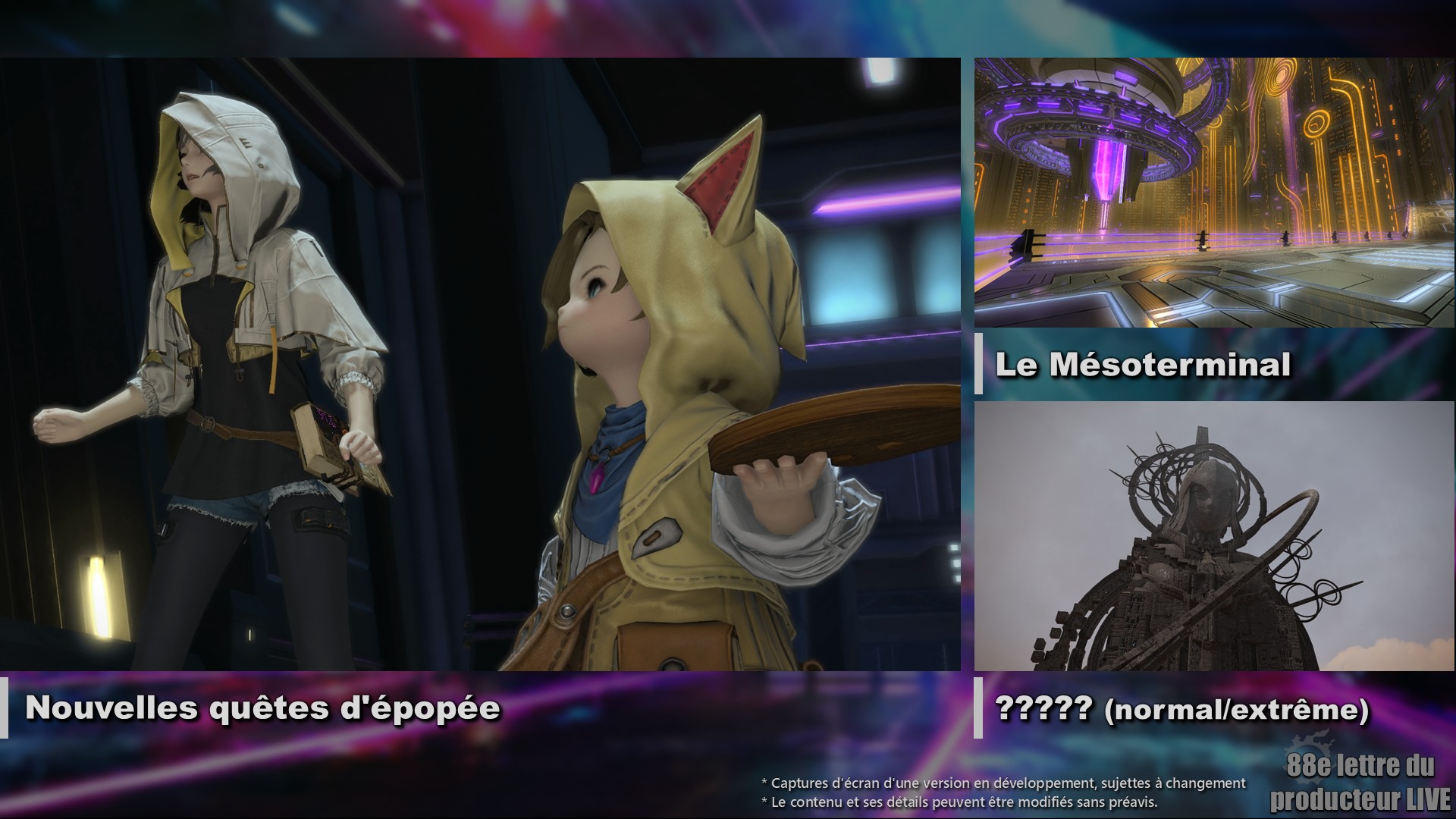 À notre grand regret, de nombreuses scènes et dialogues à venir n'ont pas pu être inclus dans la bande-annonce car ils auraient pu dévoiler quelques éléments de l'histoire… C'est pour cette raison qu'elle peut sembler plus légère et calme, sans gros points forts. Cependant, vous pouvez être sûrs que l'épopée ne manquera pas de rebondissements spectaculaires ! Naoki Yoshida a également précisé qu'il avait particulièrement demandé à ne pas utiliser une certaine musique, ce qui est assez rare.