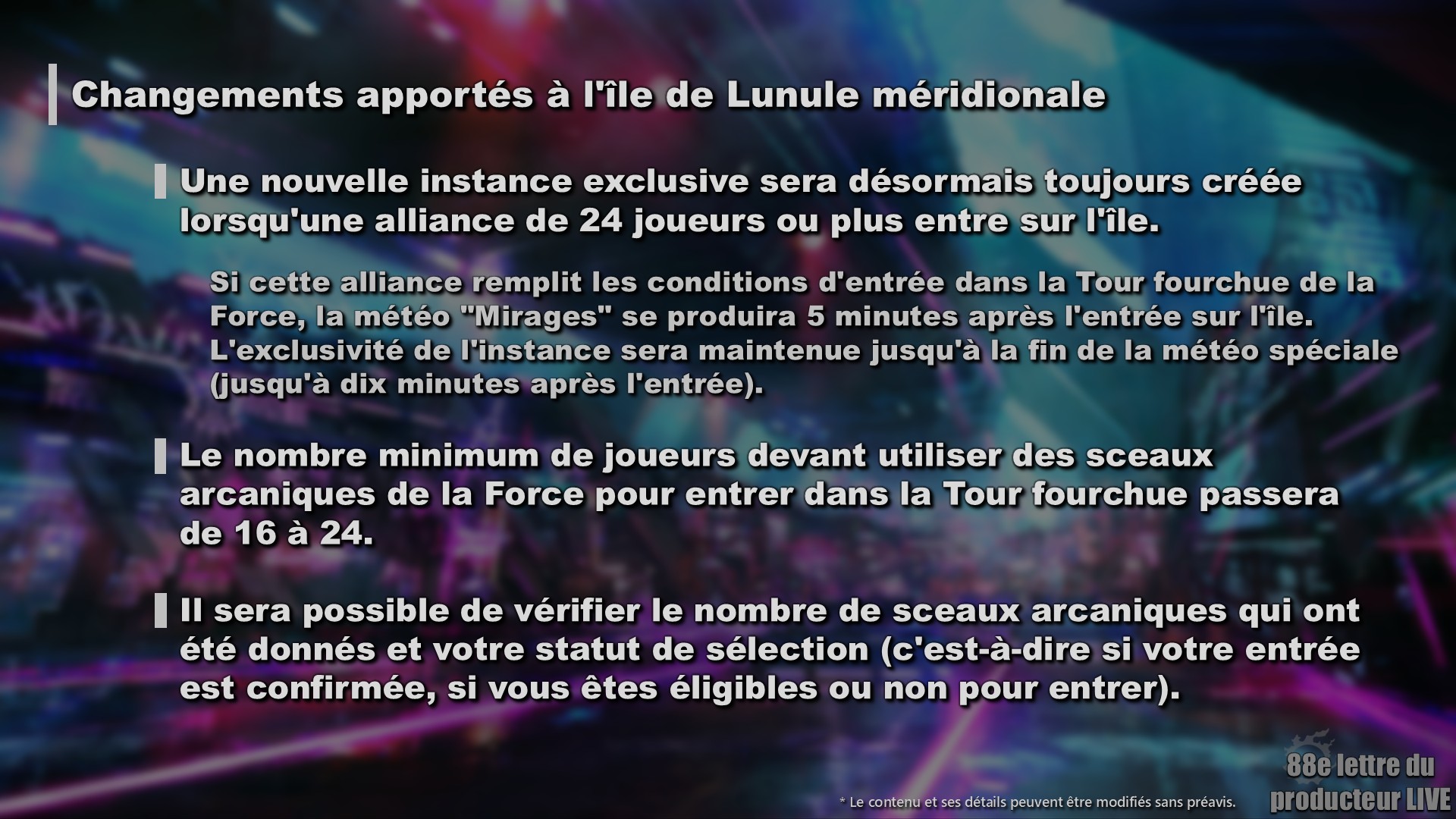 Lorsqu'une alliance de 24 joueurs ou plus entrera dans l'île de Lunule méridionale, une nouvelle instance sans aucun autre joueur sera spécialement créée. Cela permettra aux équipes préformées de relever le défi de la Tour fourchue de la Force avec tous leurs membres, sans avoir à entrer et sortir de l'île à plusieurs reprises.
