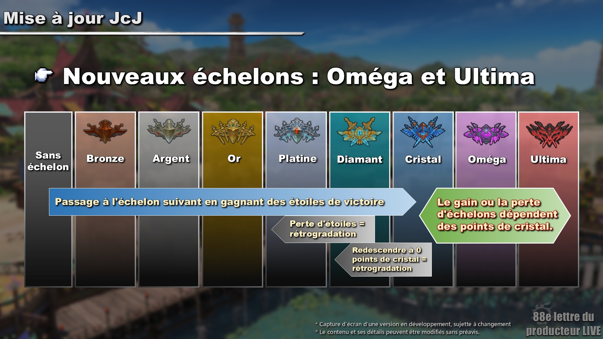 Des nouveaux échelons seront ajoutés (Oméga et Ultima) et avec eux, le passage à l'échelon suivant ainsi que la rétrogradation d'échelon seront désormais déterminés par les "étoiles de victoire" jusqu'à l'échelon Cristal. Ensuite, ils seront basés sur les "points de cristal". De plus, bien que nous ayons précédemment ajusté les possibilités de groupement vers la fin des saisons pour que les joueurs les mieux classés aient plus de chances de s'affronter, l'ajout de ces échelons devrait rendre ce système plus clair.