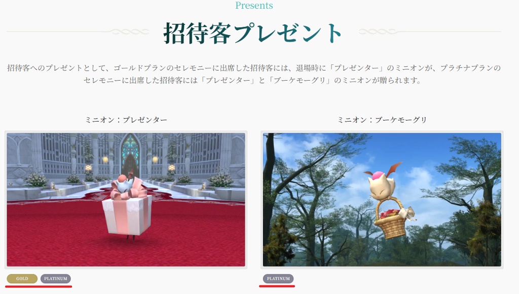 2023年9月頃の画像になりますが、招待客へのプレゼントは「プレゼンター」「ブーケモーグリ」共にゴールド、プラチナプランで贈られると公式ページに書かれていましたが、