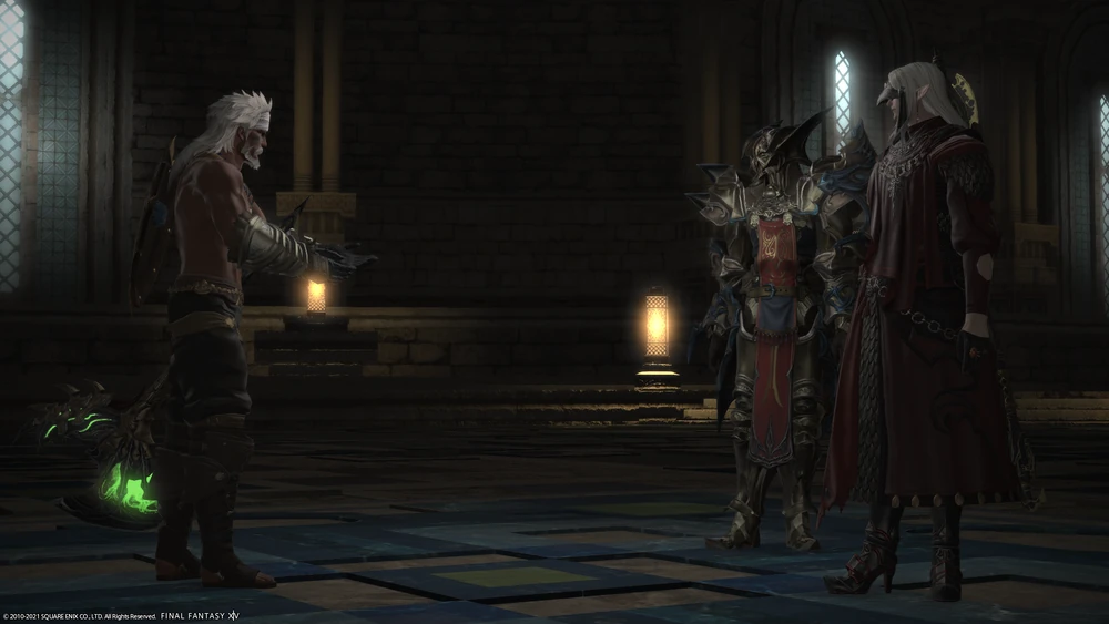 The weapon is hard to see but may be copying the one-handed axe and shield used by the beastmasters in Bozja.
