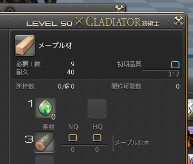 ・制作の各ギルドマスターの要求もHQです。これも「HQ素材を必要分つくったつもりが、HQ個数表示がないので、一個たりなくて、強引にNQ素材混ぜて制作したら失敗して全部パーになりました」とかありがちです。