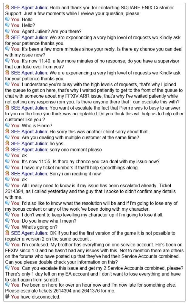 Status: As of Aug 29, 2013, I'm totally ****ed off with SEE Agent Julien or SEE Agent Pierrre or whoever that ****head is on SE Live Chat. If anyone knows the direct email address for Square Enix Customer Service please let me know.