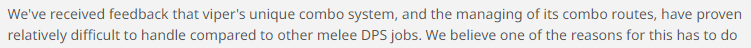 Think about it. Anyone who was struggling with Viper because they couldn't handle alternating without staring at the Vipersight Gauge (or didn't LIKE the Vipersight Gauge) will struggle MORE now. You have to look at the Vipersight Gauge MORE OFTEN, since it now has 3 step stages rather than 2, and you'll be alternating the first combo steps MORE OFTEN (since you didn't have to Dread Fangs that often with Dreadwinder anyways). If you are coming out of a Reawaken, burst phase, or boss downtime phase and don't remember if you started with Steel Fangs or Reaving Fangs most recently, you'll have to look at either your Buff Bar (with the dreaded TIMERS!!!! that they wanted to get rid of SO BADLY!!!!) or your Vipersight gauge (which they ADMIT was confusing people!!!).