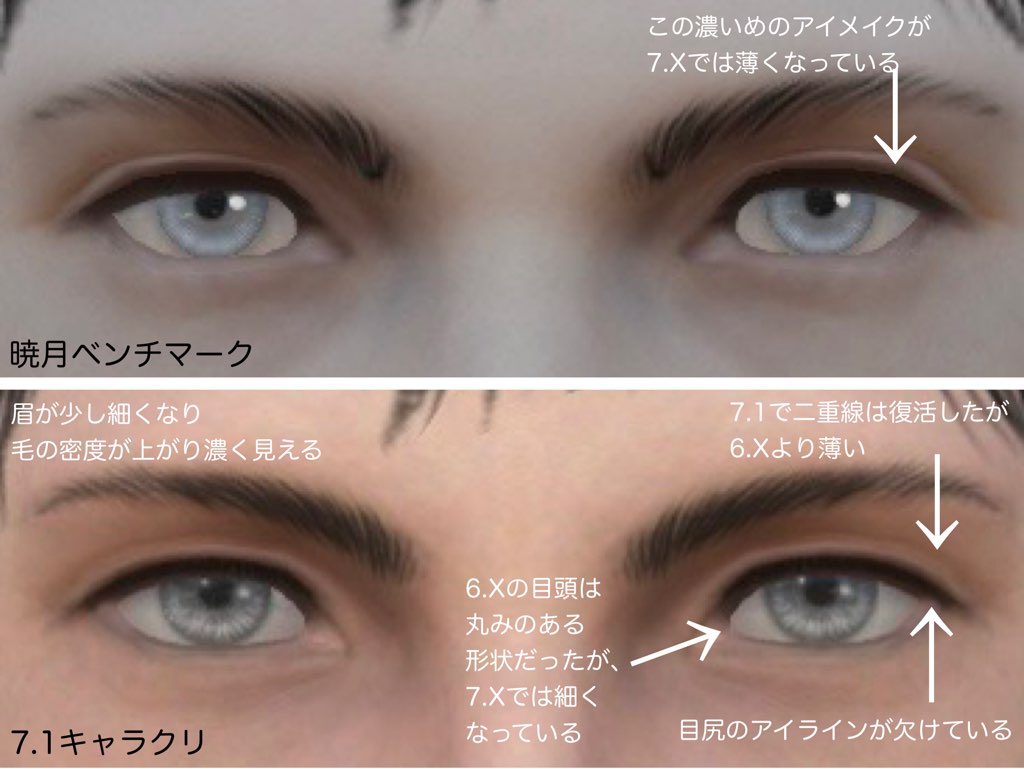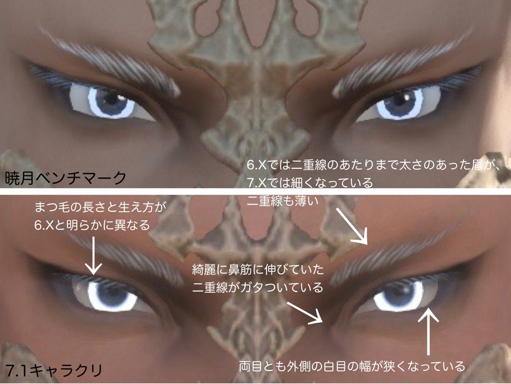 前回書き込まさせていただき悩んでいた頬前面の落ち影や、シェーダー族の目の下の隈(また目の周りも)が劇的に改善しており、漆黒以前よりも加齢して見えていた自キャラが6.0の頃に近くなった!と、とても嬉しく思いお礼を言いたく再度書き込まさせていただきました!本当にありがとうございます!