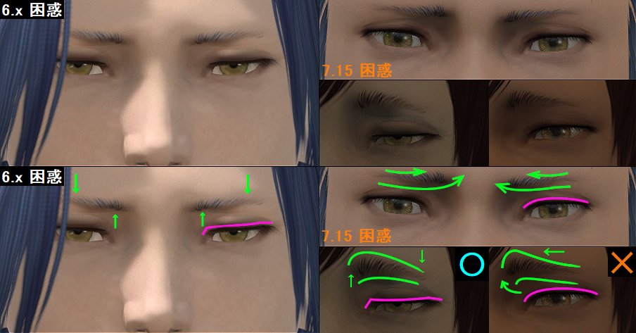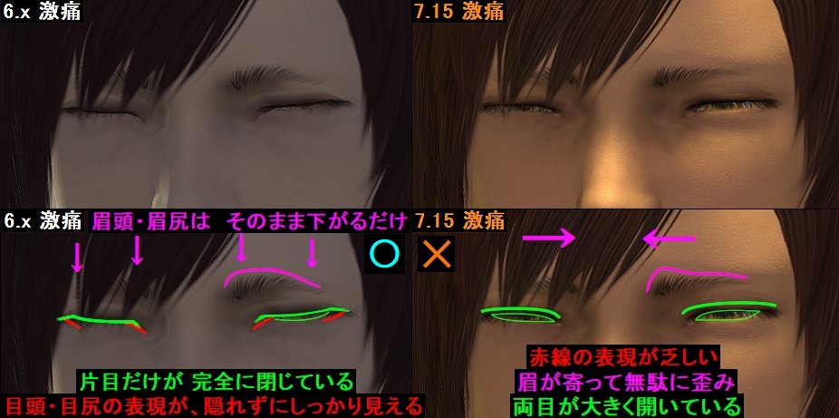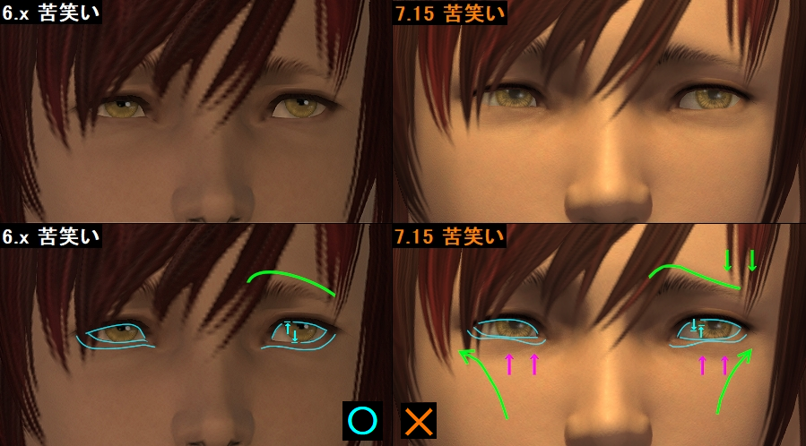 こちらも、6.xの眉はそのまま下がっているだけなのに、7.15 はいちいち寄って、眉毛が歪むという、