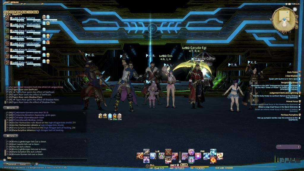 Not sure if this will count, as I hadn't planned on taking a screen shot for this thread at the time. Anyways our FC has just started working on T6, and here was a shot from after beating Twin. Full party list is visible, but this is from the area AFTER the fight (should count as you can't get here without the win I'd think).
