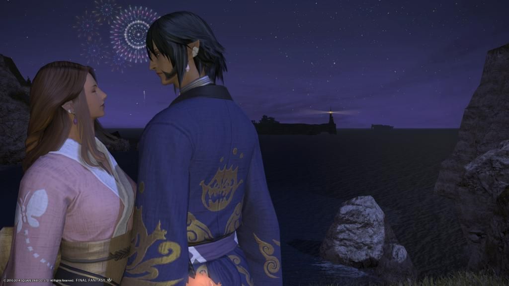 Enjoying the calming sounds of the waves and the bright lights of the fireworks under the moonlight.