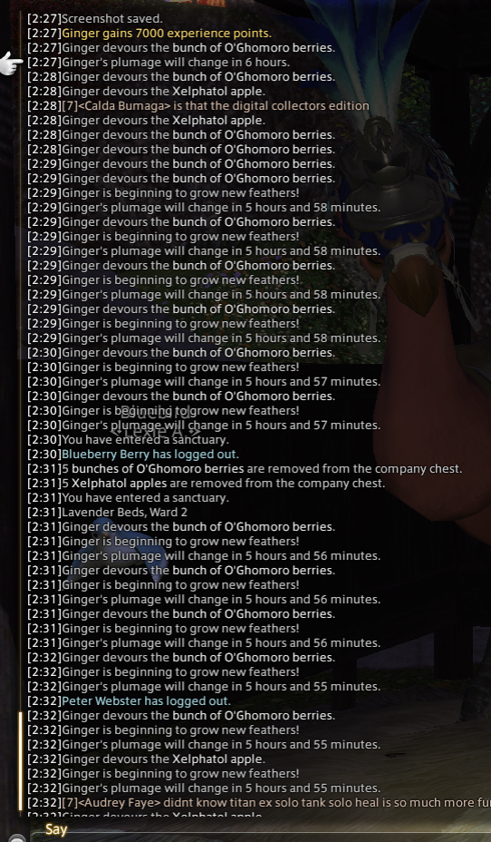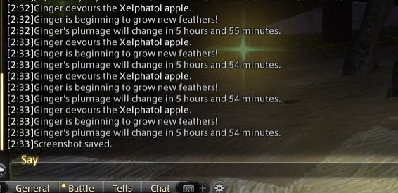 went from rolanberry red last night to dalamud red. fed 3 valfruit (only 1 gave feather message) and 4 apples (all gave feather message)