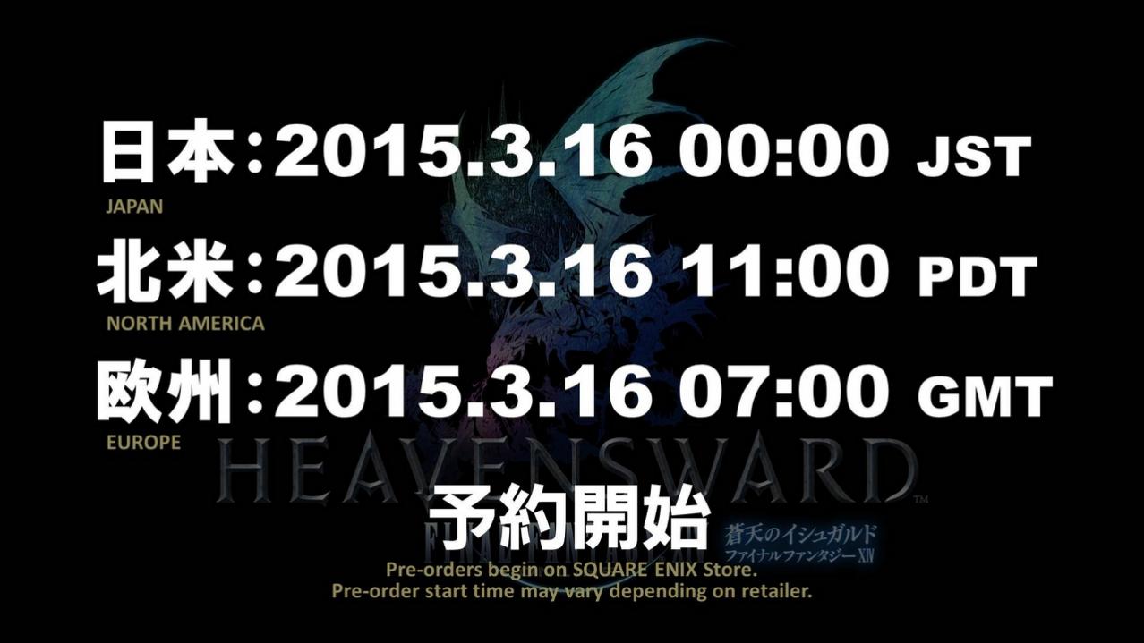 Q: When do pre-orders start for Heavensward?During PAX East 2015 we announced that pre-orders would begin on Monday, March 16, 2015. Pre-orders start at midnight JST for the Japan SQUARE ENIX e-STORE, 11:00 a.m. PDT for the North America SQUARE ENIX ONLINE STORE, and 7:00 a.m. GMT for the European SQUARE ENIX ONLINE STORE. Other online stores and physical locations will begin afterwards.