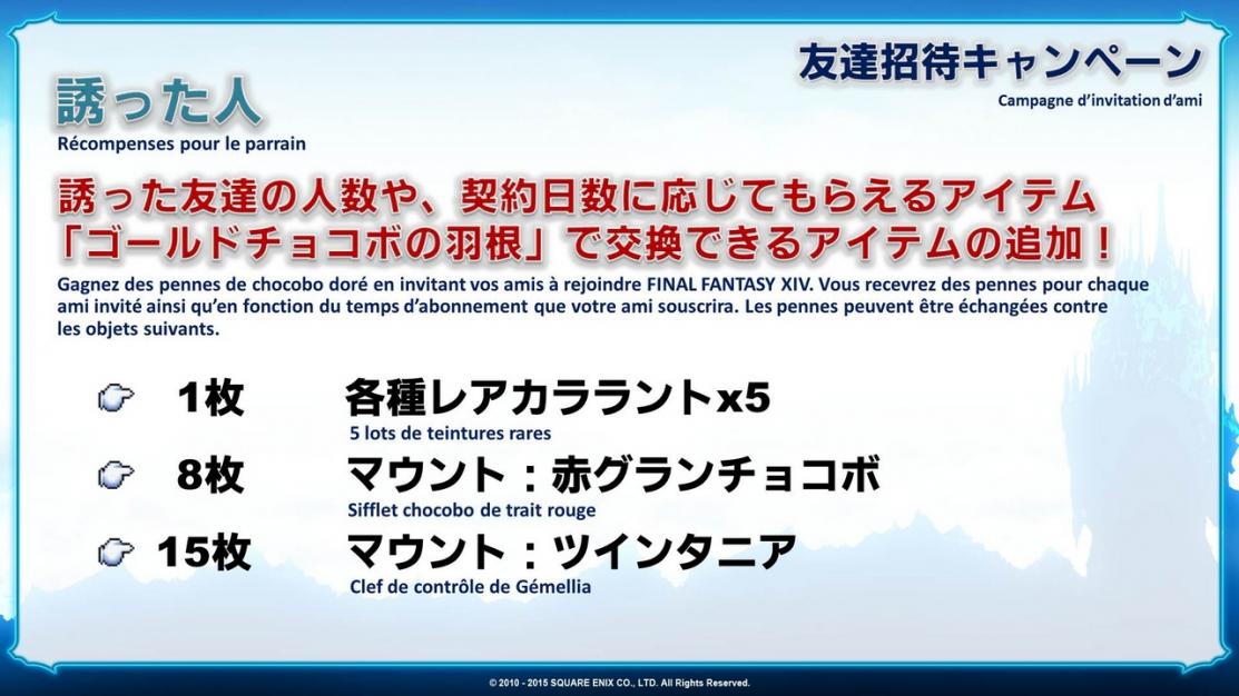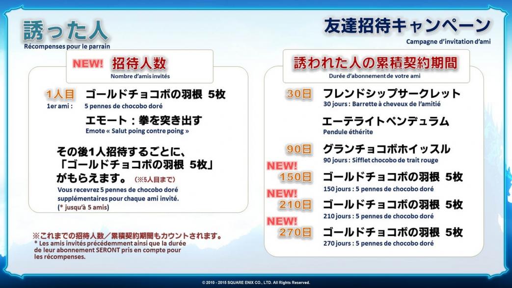 Il s’est passé pas mal de temps depuis que nous avons lancé la campagne d’invitation d’ami de FFXIV et certains d’entre vous qui en ont bénéficié dans le passé recevront de nouvelles récompenses si vos amis jouent toujours à FFXIV.