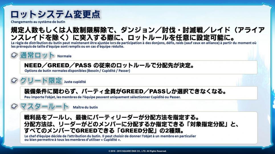 « Cupidité uniquement » fonctionne de la même manière que ce que les groupes formés via la Recherche d’équipe utilisent déjà entre eux à l’heure actuelle. Peu importe le job joué, vous pouvez uniquement utiliser « Cupidité ». Jusqu’à la mise à jour 3.0, le système ne permettait pas ceci mais nous avons ajouté un système pour remédier à cela.