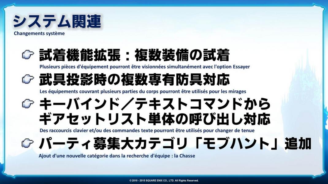 R : Il semblerait que beaucoup de personnes soient gênées par les effets des autres joueurs. Cependant, ceci n’est pas si facile ; nous ne pouvons pas simplement avoir un paramètre pour l’activer ou le désactiver. Il y a une tonne de personnage sur FFXIV et les effets des actions de job sont affichés instantanément avec le système recevant les informations des jobs que tout le monde joue. Méditation du Moine et Ténèbres intérieures du Chevalier noir sont regroupés dans la même catégorie et si nous ajoutions un paramètre pour ne pas afficher les effets de Ténèbres intérieures, ceux de Méditation ainsi que les autres effets ne seraient plus affichés non plus, il faudrait donc tout séparer. Ceci augmenterait le montant de catégories d’effet et aurait pour conséquence un environnement moins confortable pour les joueurs. En raison de ceci nous ne pouvons pas implémenter une telle fonctionnalité. Ce n’est pas un problème de mémoire, c’est un élément qui est en place afin que les joueurs puissent profiter du jeu plus confortablement. Je vais de nouveau parler à l’assistant-réalisateur Takai à ce sujet.0:14:50