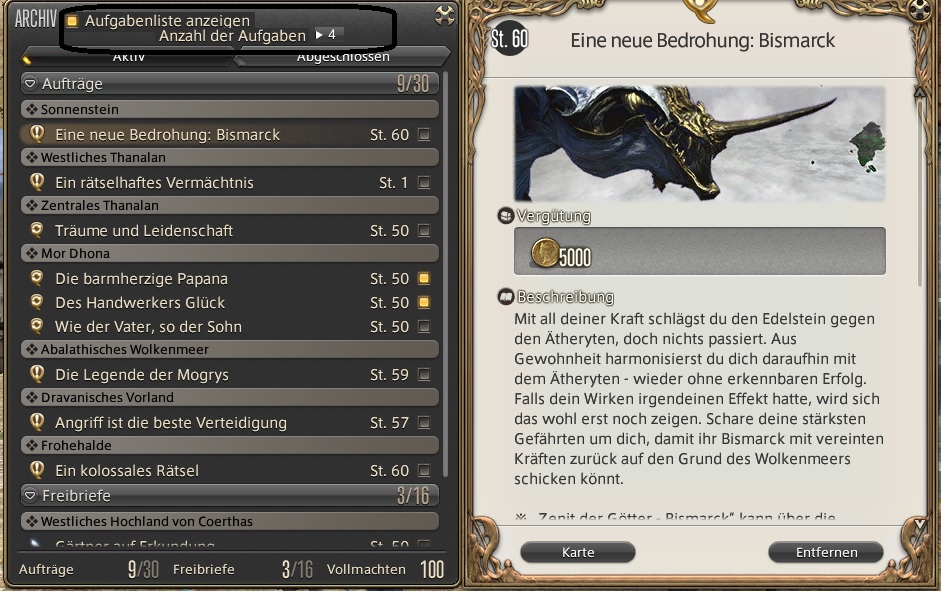 Aufgaben im Questmenü ausblenden und Anzahl werden angezeigt.