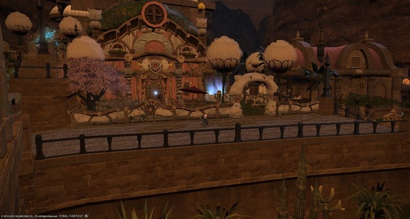 Perched with Estinien on our neighbour's rooftop and enjoying the wonderful view of the Goblet residential plot (shameless usage of Thordan mounts for the purple glow) XD