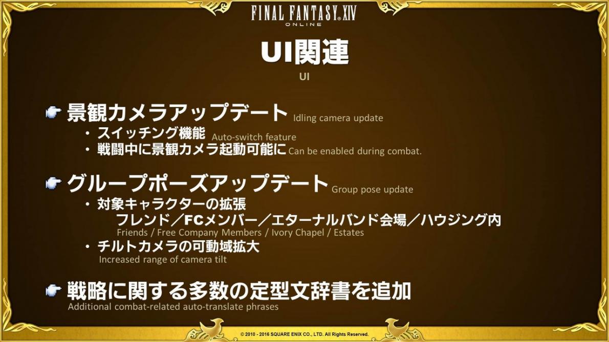 In response to players wanting to use idling camera angles to view their characters in the heat of combat, the idling camera will be usable during battles as well. However, please make sure to ask your party members before using the camera when running trials or dungeons.