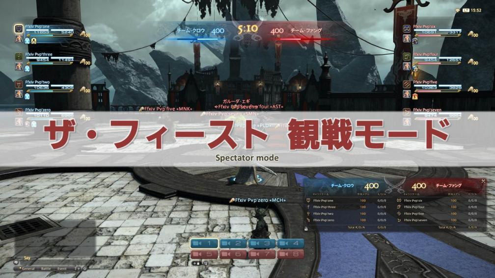 0:29:12A new spectator mode will be introduced to PvP in Patch 3.4. The spectator mode will allow players to see information for all the players on both teams. This includes information such as the players' current adrenaline gauge status, as well as the players' current recast time on the PvP skill Purify. Players can switch their view between eight cameras placed on the arena with the click of a button. Please note that the spectator mode being introduced in Patch 3.4 is set up to be used mainly for events. Players engaging in custom matches will need to invite a those who wish to spectate as a third party using the subcommand menu. We’re currently planning to make it possible to select a match from a list to spectate in the future, so please look forward to this!