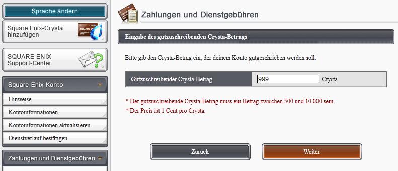 Danach kann man auswählen wie viele Crysta man kaufen will, ich habe mich jetzt im Beispiel mal für 999 entschieden weil das den 9,99€ entspricht, die Basisdienst + ein Charakter kosten: