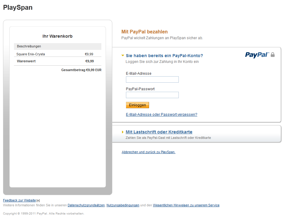 Nimmt man also Paypal als Option, öffnet sich ein weiteres Fenster, diesmal von Paypal, und man kann sich entweder einloggen oder mit Lastschrift/Kreditkarte als Gast bezahlen: