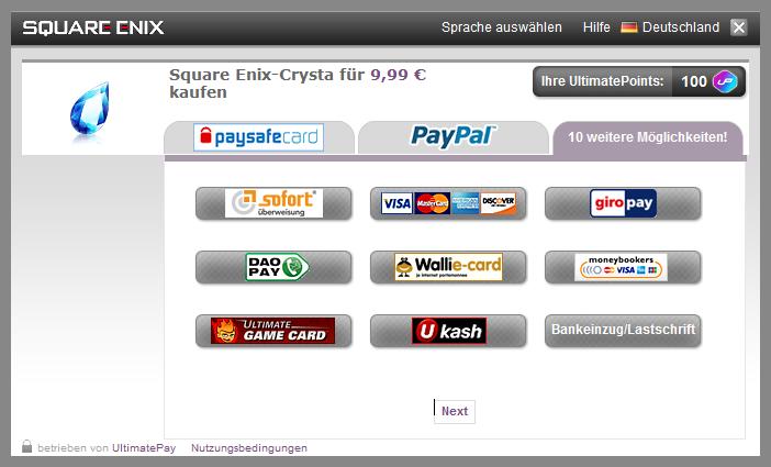 Das verstehe ich auch nicht so ganz, ich bin es von anderen P2P-MMORPGs eigentlich gewohnt auch mehrere Zahlungsmethoden direkt und ohne Umweg über Crysta bei UltimatePay nutzen zu können.