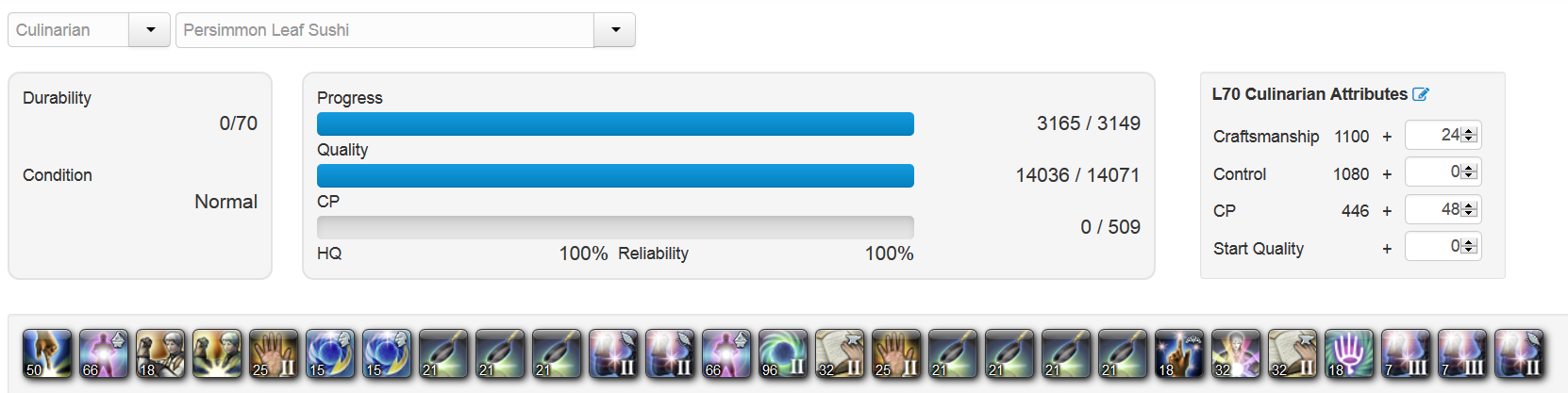 Following on from the above, on the basis of the simulator you can drop the Ing2 back to Ing1 if you meld just 7 points of control. Use can then run this rotation with HQ 70, max meld CP and purchased NQ Tempura.