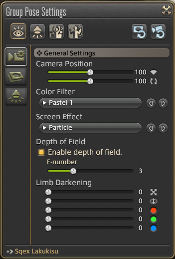 Colour filters, screen effects, depth of field, and limb darkening can be found inside the General Settings section and frames can be found inside the Effect/Motion/Subject Settings.