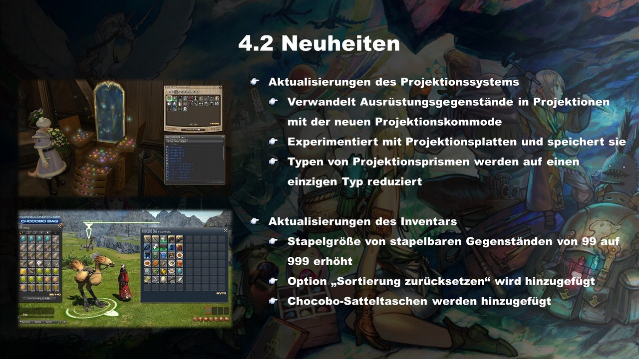 Man kann an den Tauchbooterkundungen teilnehmen, selbst wenn man kein Luftschiff für die Erkundungsmissionen gebaut hat. Auch für die Tauchbooterkundungen gibt es Gegenstände und Begleiter, die man nur dort erhalten kann.StahlschwingenWir wollen Anpassungen an einigen Aspekten vornehmen, wie etwa die Auswirkungen, wenn man das zentrale Areal für sich beansprucht, an den Marionetten und der Reichweite der Dampfkanonen.Ausrüstung für die Sammler- und HandwerksklassenEs wird für die Sammler- und Handwerksklassen keine neue Ausrüstung geben, die besser ist, als die Ala Mhigische Ausrüstung mit einem kompletten Materia-Set und wir werden auch keine neuen Nebenhand-Werkzeuge implementieren. Es wird allerdings Ausrüstung geben, die besser ist, als die existierende, sofern sie kein komplettes Set an Materia beinhaltet.Bonuscodes für SpielgegenständeVor kurzem haben Spieler bemerkt, dass Bonusgegenstands-Codes, die in FFXIV Merchandise enthalten ist, für einen Charakter ausgegeben werden, anstatt für alle Charaktere auf einem Account. Der Grund dafür ist, dass es ein Limit gibt für Gegenstände, die auf einen ganzen Account angewendet werden und derzeit ist es sehr schwer das Limit zu erweitern. Wir werden uns der Sache annehmen und euch Bescheid sagen, wenn wir ein Update zu dem Fortschritt haben.“Schwere”, wenn ihr von hinten auf einem Reittier angegriffen werdetAm Ende der Übertragung haben wir erwähnt, dass Spieler nach Patch 4.2 nicht mehr von dem „Schwere“-Status betroffen werden, denn sie auf einem Reittier von hinten angegriffen werden.