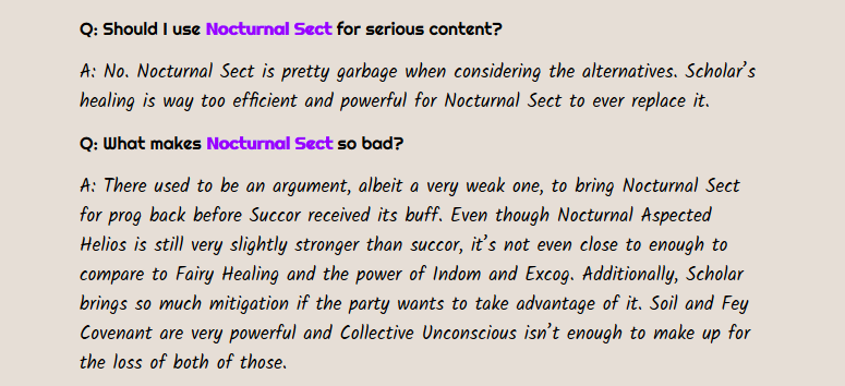 (...). While slight changes to Nocturnal Sect might be good, it can't and shouldn't change drastically. Right now you can use Noct Sect comfortably, but too far in either direction and it'll either make them too weak, or out perform SCH by a wide margin. SCH still needs to be the "sheild" healer, not AST.
