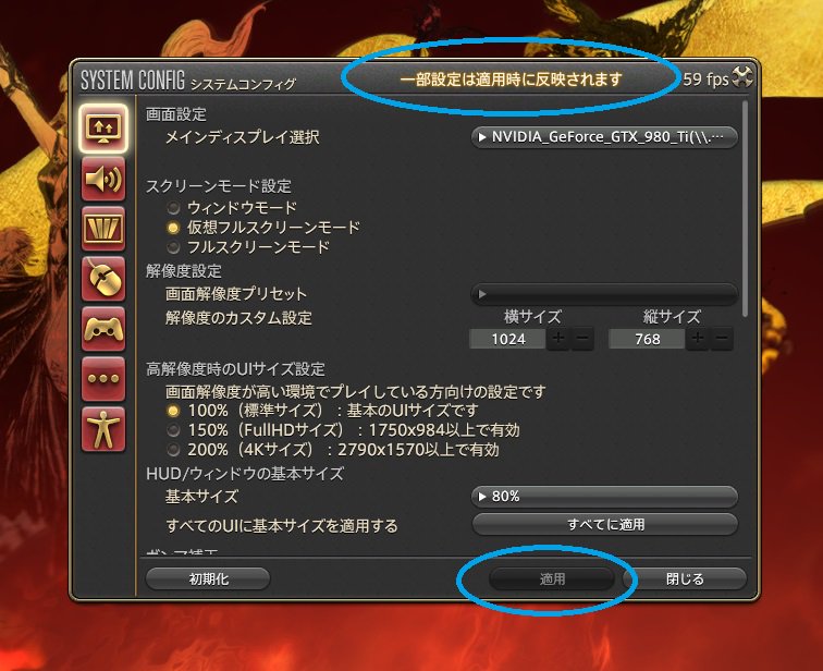 (例1:ウィンドウモードから仮想フルスクリーンモードにチェックをつけかえる