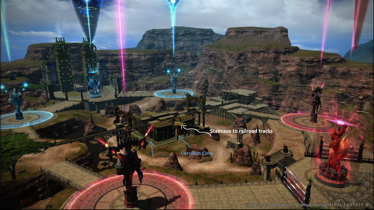 I'm guessing that the building in the center of the map is where the Ceruleum core is. I noticed it has a stair case on both ends that lead up to the railroad tracks.