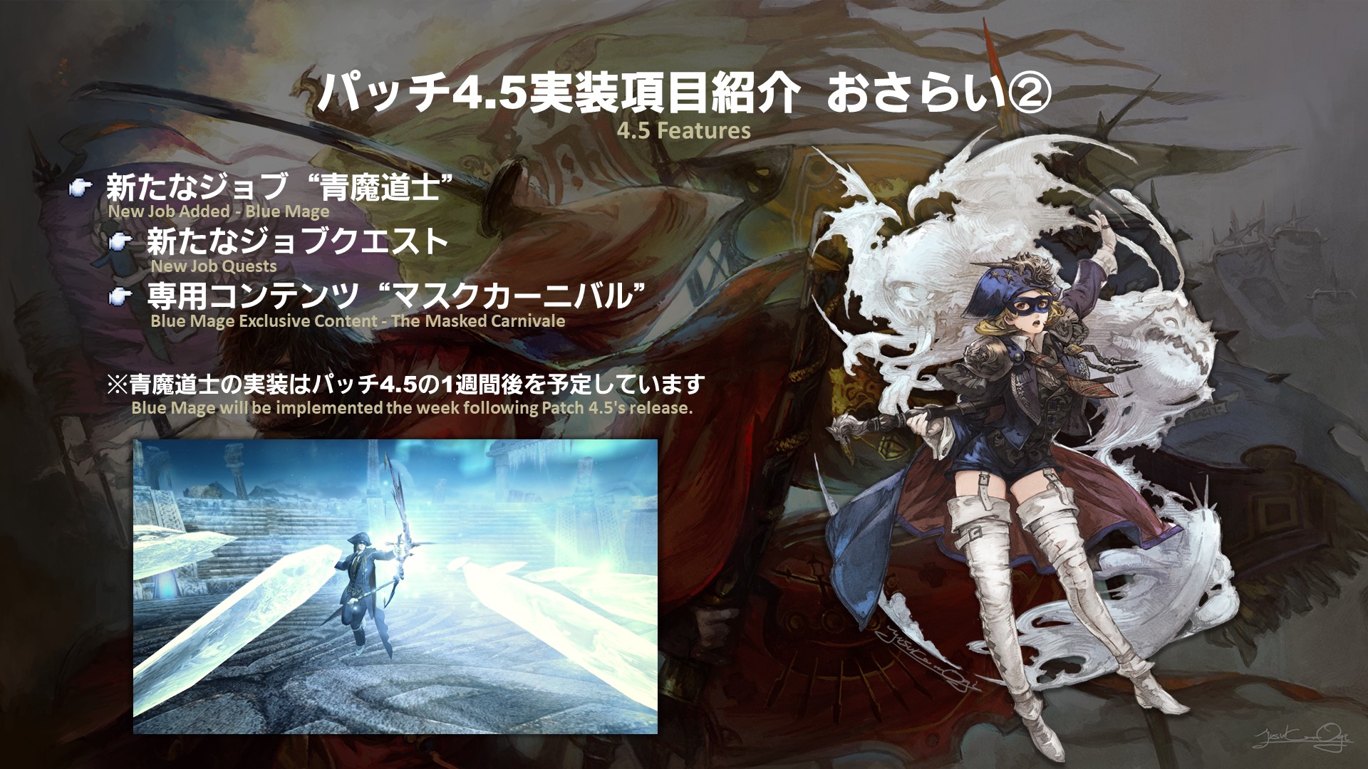 We would like players to be able to focus on the main scenario and Return to Ivalice story with the release of Patch 4.5, so blue mage will be released a week after the patch goes live. The blue mage content will be implemented with the same system as seasonal events, so there is currently no maintenance scheduled for this release. However, please note that if any hot fixes need to be implemented, there may be maintenance.