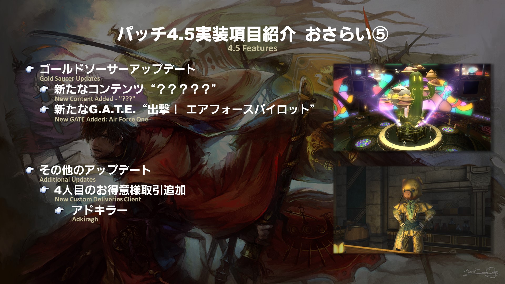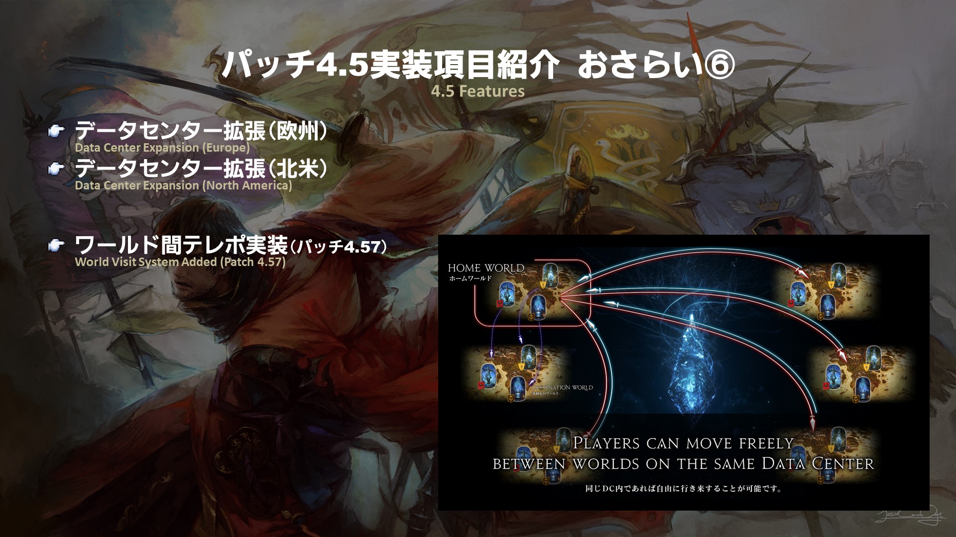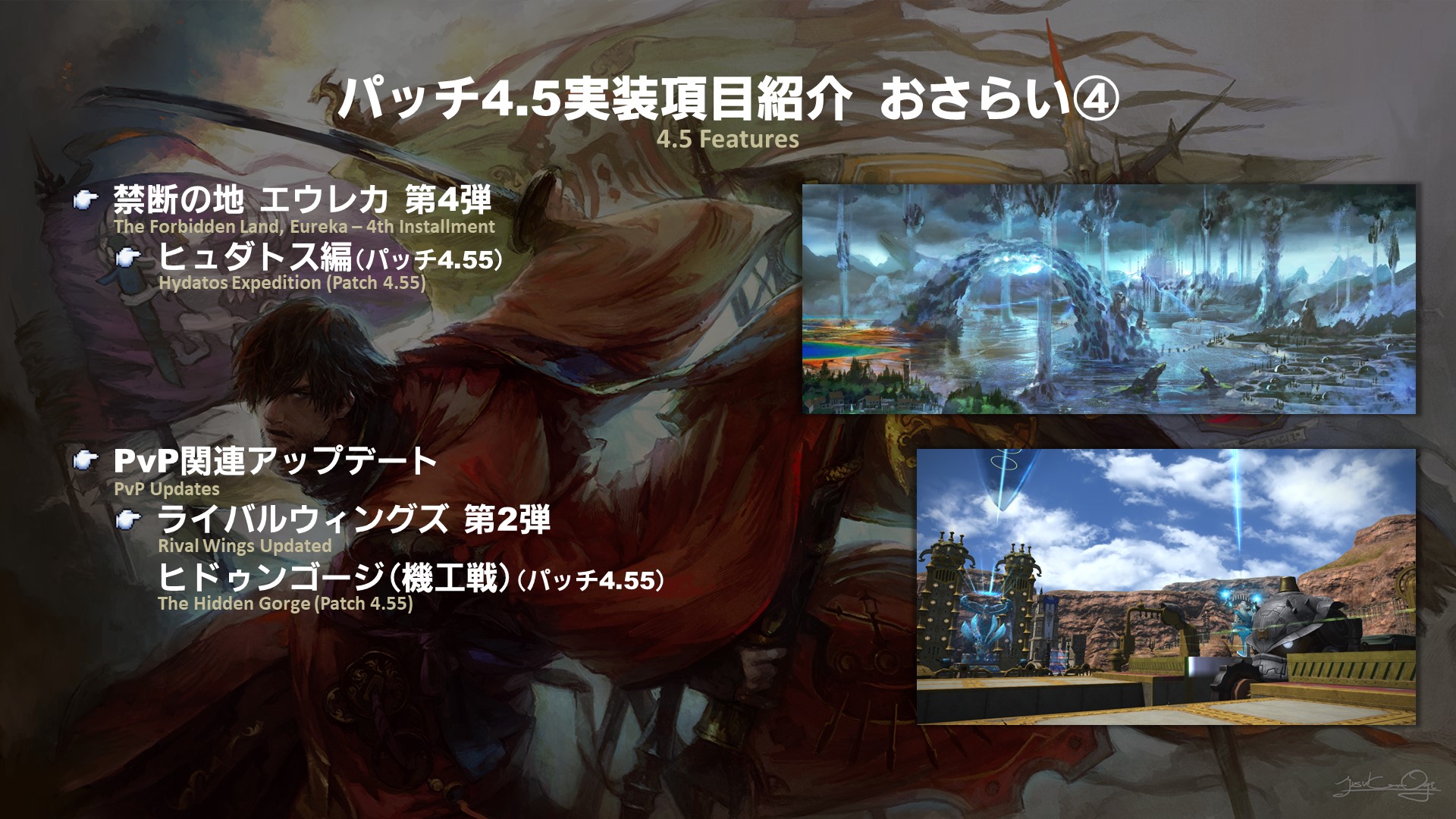 Patch 4.5 is the final major update in the 4.x series and will be released in two parts. The first part is scheduled for release on Tuesday, January 8th and the second part is scheduled for release in late March. We also have two more Fan Festival events that will take place in Europe and Japan. We planned our content release schedule around the Fan Festivals so that everyone could enjoy new scenarios and content in between announcements, so please look forward to it!