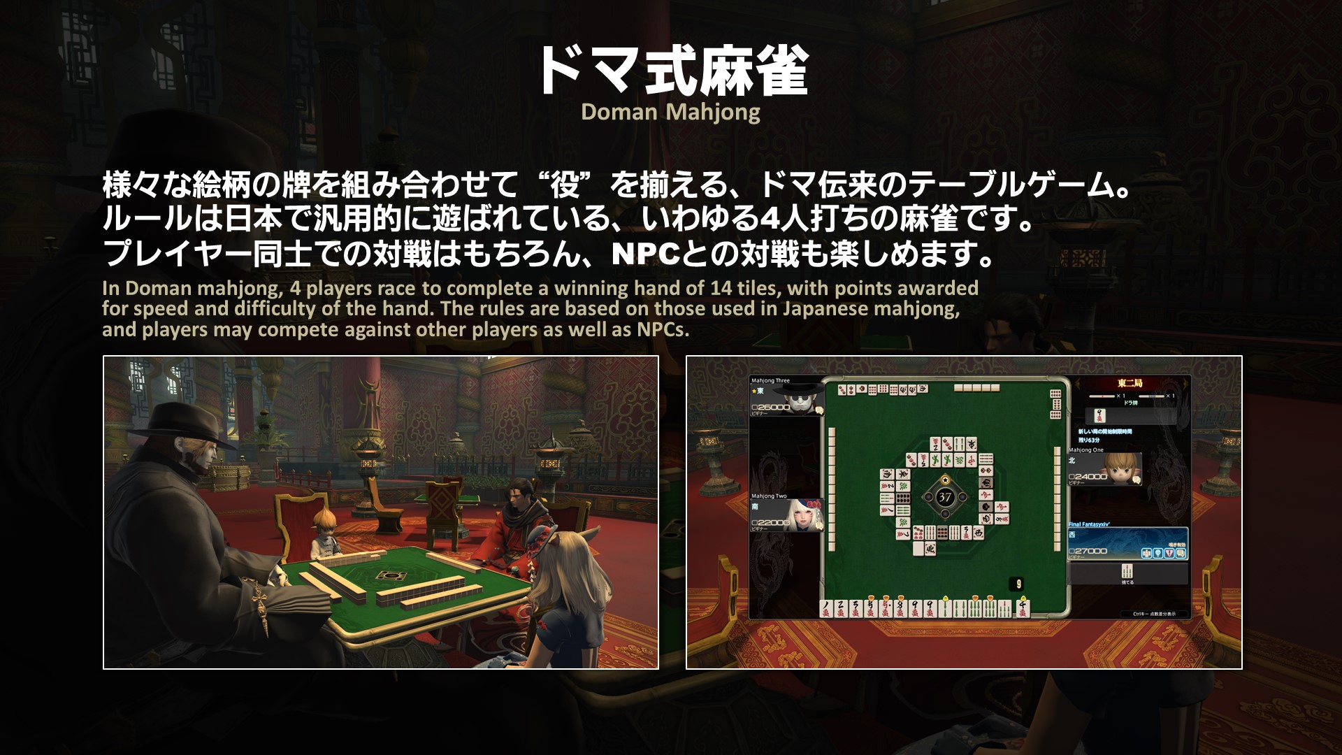 We’re sure that some players might have concerns as to why this kind of content was designed, and how it fits into the world of FFXIV. Doman Mahjong was developed by a just few members of the dev. team, and also utilizes a game engine that specializes in mahjong games, so we really haven’t put that many resources into implementing this content. We also wanted to give players globally a chance to experience a broad variety of types of gameplay. As we continue to create original content for FFXIV, we would also like to implement other various types of online game features not normally found in an MMORPG setting, so please look forward to them!