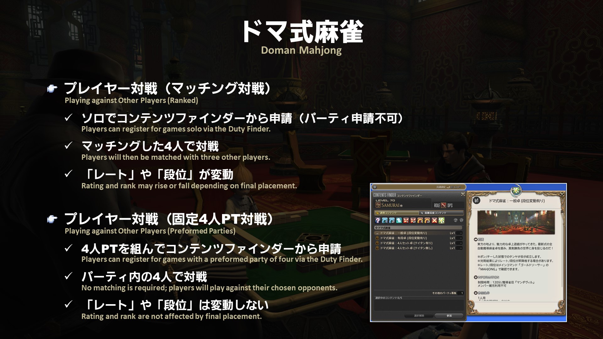 We’re pleased to introduce some brand new Gold Saucer content coming in Patch 4.5: Doman Mahjong! Check out the live gameplay footage where Yoshi-P uses the Duty Finder to match against other players.