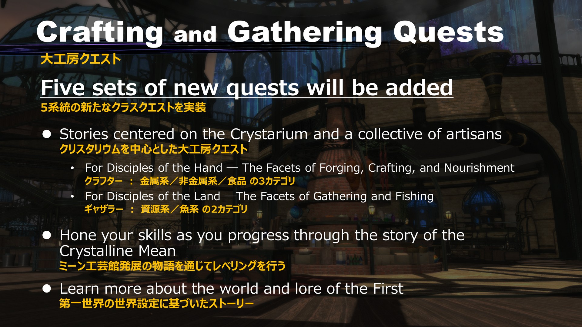 These new quests centered on the Crystarium will act as the new class quests for Disciples of the Hand and Land. As there are a large number of crafting and gathering classes, we categorized the quests into five different sets, which allowed us to focus on developing the quality of each individual quest.