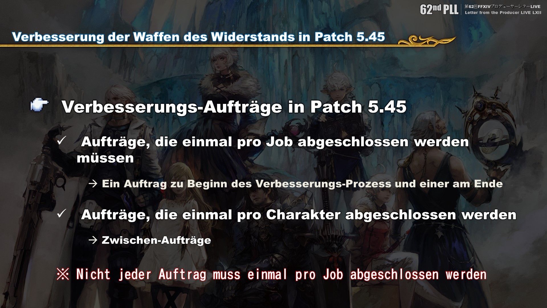 Wir haben auch Feedback erhalten, laut dem das wiederholte Durchlaufen der Allianz-Raids zur Verbesserung der Waffe für Spieler abschreckend ist. Es ist jedoch so, dass die Waffe des Widerstands eine mächtige Waffe sein sollte, die durch langfristige Arbeit erlangt werden kann, also würden wir euch gerne daran erinnern, dass dies seine Zeit brauchen wird. Uns ist aber auch bewusst, dass der Wunsch besteht, die Verbesserung der Waffen des Widerstands durch die Bozja-Südfront zu erleichtern, oder das Gegenstände zur Verbesserung zu selten vonerhalten werden können, also werden wir einen HotFix veröffentlichen, um einige Dinge nach Möglichkeit anzupassen.